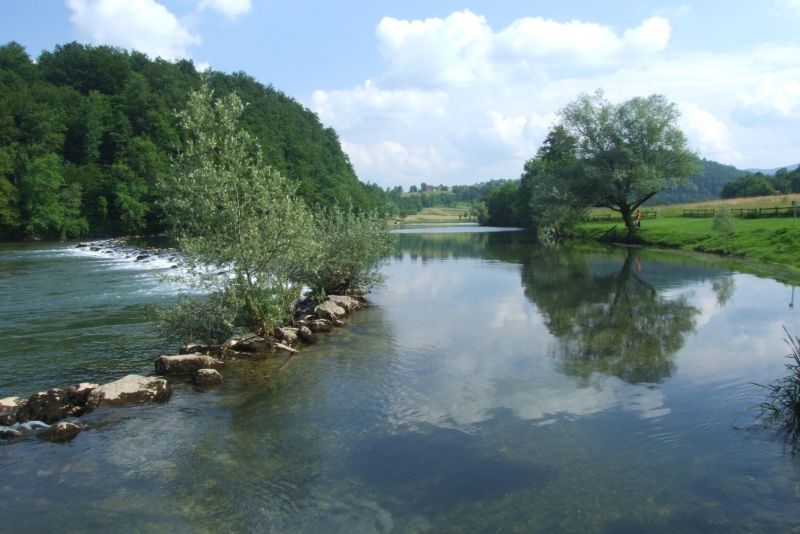 Malo naprej je levo odcep za Podzemelj, kjer se pelje bliže Kolpe. Ta cesta nosi oznako 919. Tu me ujamejo prve kaplje, zato se ustavim in zamenjam rokavice. Kasneje se izkaže, da sem ujel le rep nevihte, ki je pustila samo mokro cesto. Ob tej cesti je veliko možnosti za kampiranje in kopanje, le opazovati je potrebno. V kraju Dolenjci zavijem levo proti Adlešičem in se priključim na 660, ki kasneje zopet postane 919. Vmes sledijo odmaknjene vasice na gričih, ki ponujajo lep razgled (sl05). Vidi se celo Klek - hrvaška podružnica našega čarovniškega štaba na Slivnici. Opazili ga boste kot strmi zob, ki se nahaja v okolici Ogulina. Tu zgoraj se Kolpe dejansko ne vidi, bolj je opazna dolina, po kateri se vije. Ko pridem v Vinico, zavijem desno in na naslednjem križišču levo. Cesta še vedno nosi isto oznako. Končno sledi spust v dolino in Kolpa postane bolj otipljiva.
